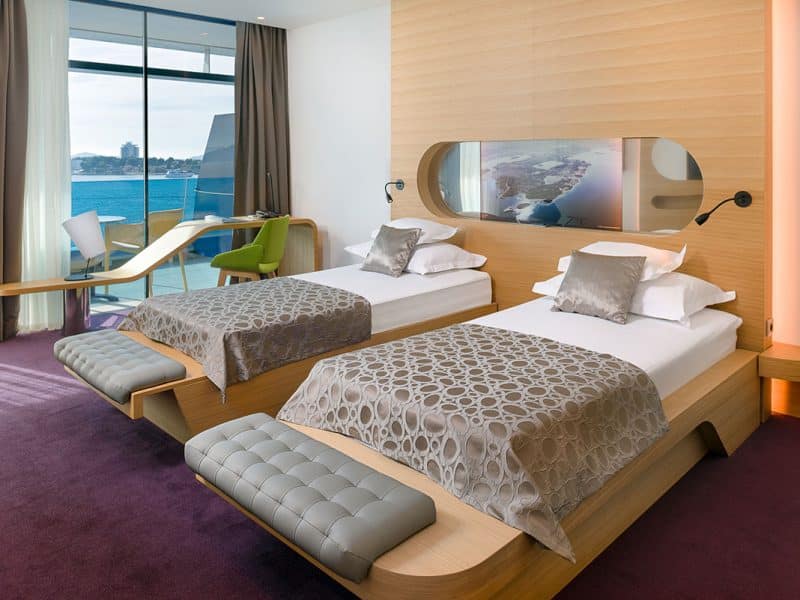 Grand Spa suite – jacuzzi terasa pogled more – od 72 do 82 m2 + terasa opremljena ležaljkama 100 m2, jacuzzi na terasi, dvije spavaće soba od kojih je jedna u produžetku dnevnog boravka, sobe sadrže moderan pisaći stol sa stolicom, aparat za kavu, fotelju, 2 x LCD televizor, sef, mini bar, 2 x kupaonica s kadom ili tušem i duplim umivaonikom, luksuzna Rituals kozmetika ( max za 4 osobe)